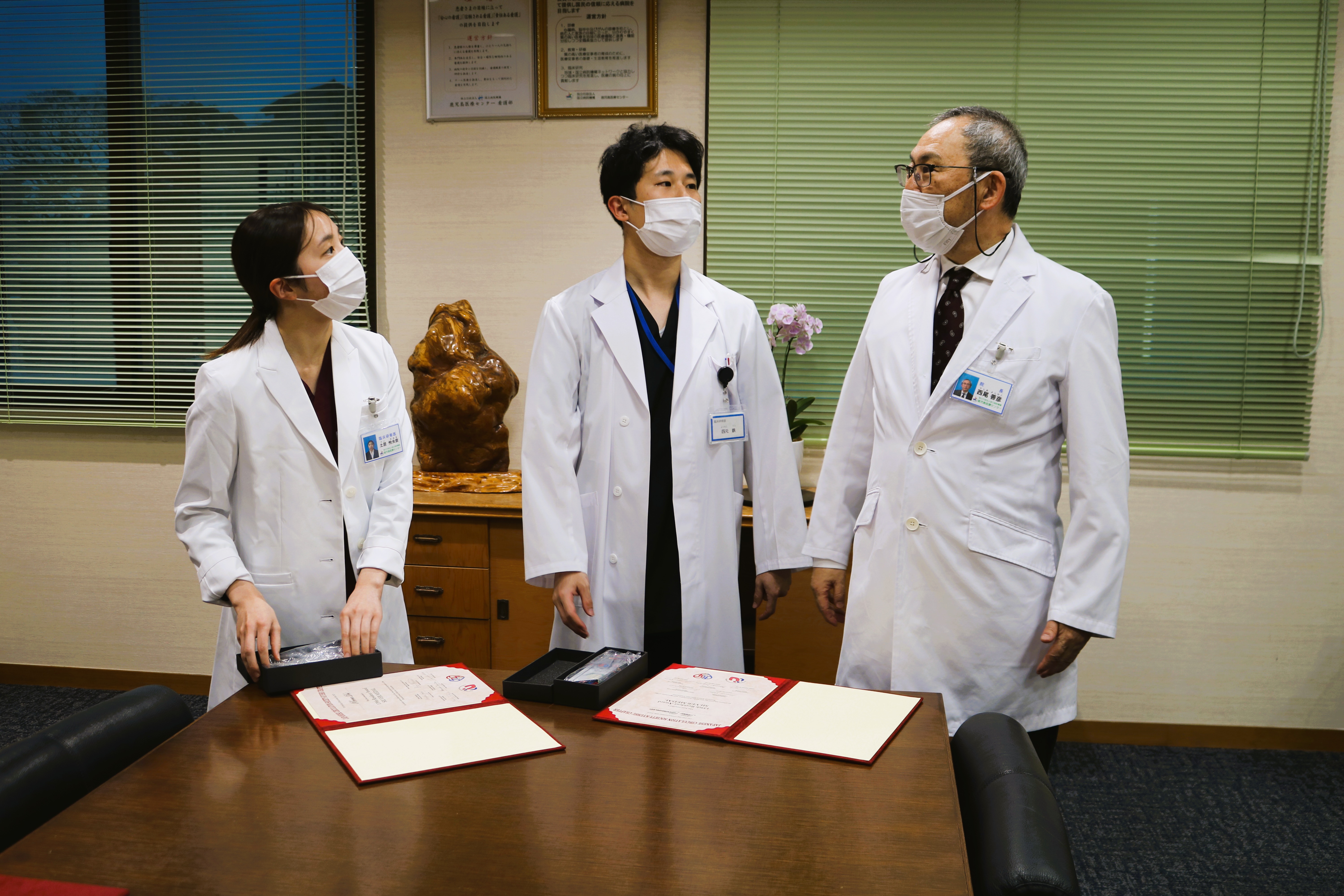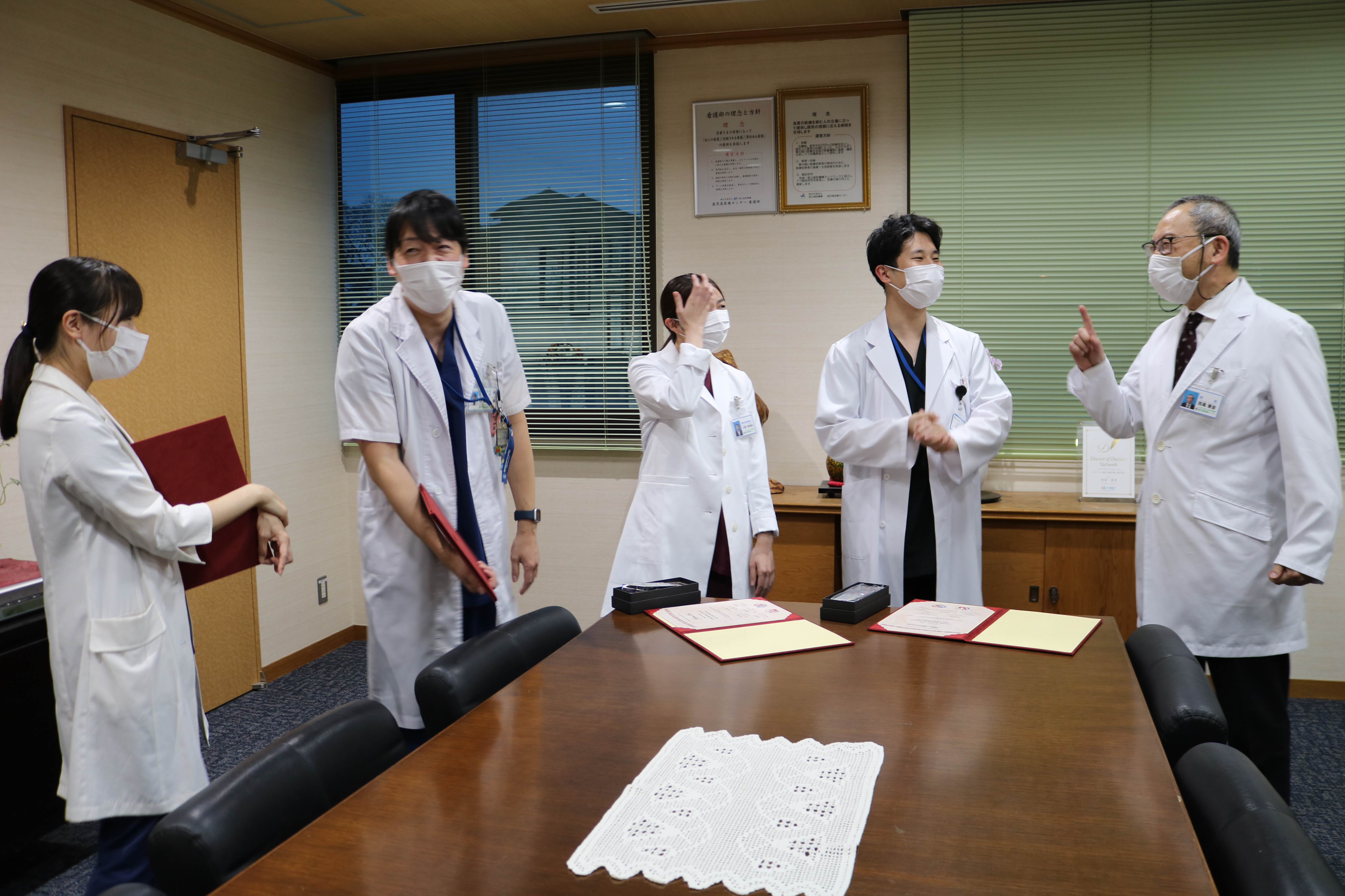 2025年12月6日に開かれた、第139回 日本循環器学会九州地方会で、鹿児島医療センター研修医、四元 鉄先生、土居 怜央奈先生が優秀演題賞を、指導した中別府 麻里先生、伊集院 駿先生がメンター賞を受賞しました。院長先生に報告を行いました。研修医の先生方の今後の益々のご活躍をお祈りしています。